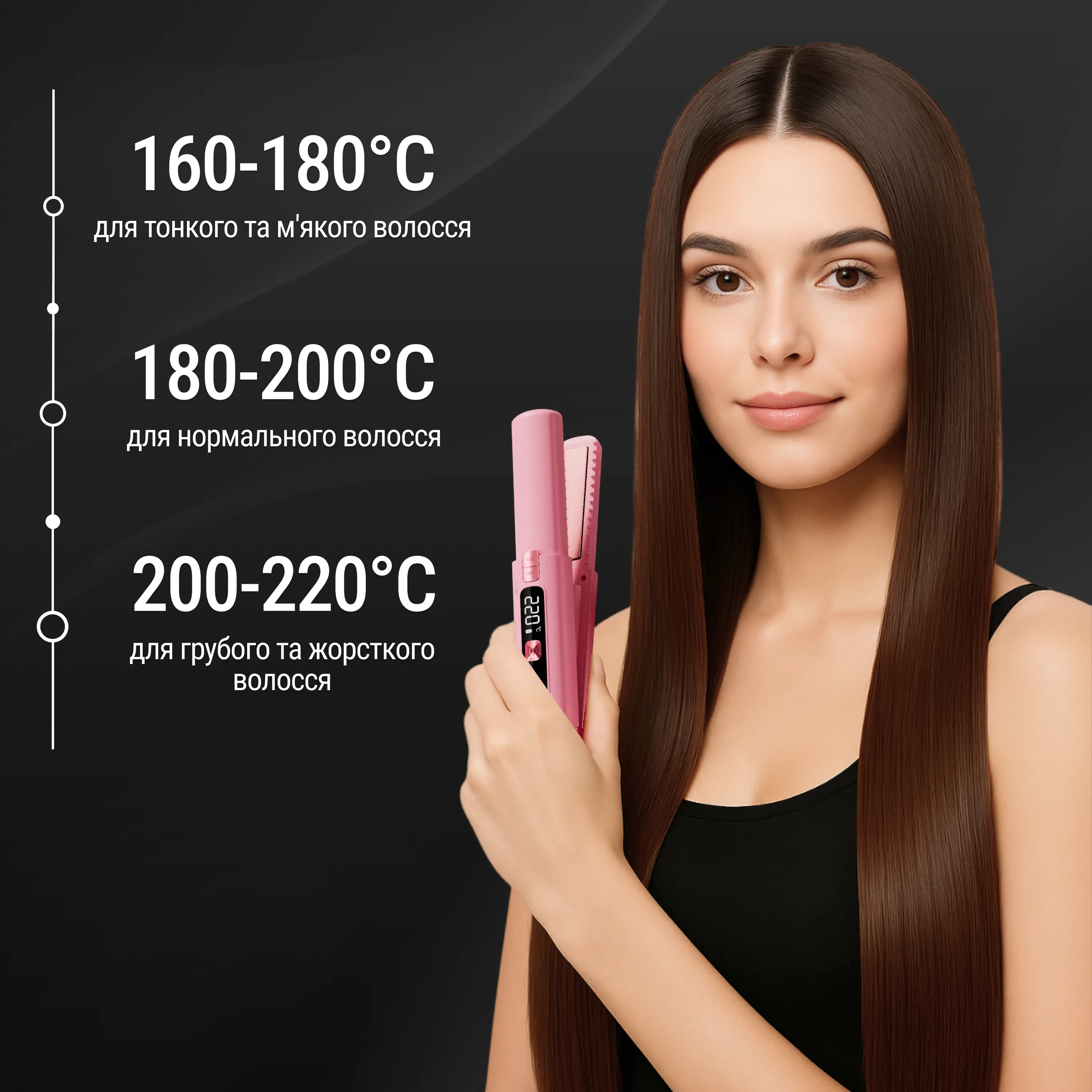 Портативний вирівнювач для волосся - це зручний інструмент для швидкого та ефективного створення ідеальної укладки у будь-який момент. Завдяки регулюванню температури пристрій підходить для всіх типів волосся: